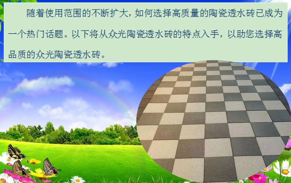 焦作市眾光耐酸瓷業(yè)有限公司生產(chǎn)的陶瓷透水磚發(fā)揮自身的力量,促使城市的花花草草健康成長,雨天路面不積水,干旱的季節(jié)把儲存的水分供給植物。