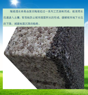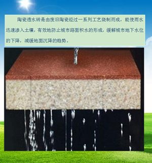 陶瓷透水磚是磚體透水,吸水,快速透水功能,可以防止地下水枯竭,減輕下水道的負擔。防止城市內(nèi)澇,降低周邊環(huán)境溫度,改變熱島效應(yīng)。另外,由于強大的透水功能,即使下雨走路也不濕鞋,不濺起。