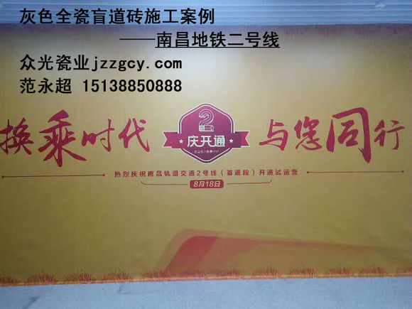 灰色全瓷盲道磚廠家 ——焦作市眾光耐酸瓷業(yè)有限公司,熱烈祝賀南昌地鐵二號線首通段峻工,8.18進(jìn)入換乘新時代,開通儀式將在中建五局建設(shè)的地鐵大廈站隆重舉行,眾光瓷業(yè)全體員工祝開通儀式順利舉行!