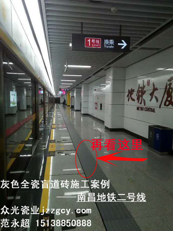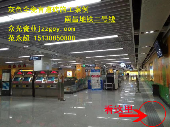就在今天這個喜慶的日子里,激動人心的時刻到了,南昌地鐵二號線在經(jīng)過建筑工人們近一年的艱苦奮戰(zhàn),已于近日峻工完成,今天就是試運(yùn)日,開通儀式將在地鐵大廈隆重舉行。該地鐵線路施工所使用的盲道磚均采用的是眾光灰色全瓷盲道磚,施工前期使用的大部分規(guī)格為400*400*20,后期有使用少量300*300*20的規(guī)格。眾光灰色全瓷盲道磚不只應(yīng)用于南昌地鐵,北京地鐵、鄭州地鐵、武漢地鐵等國內(nèi)許多城市的地鐵都采用的是眾光灰色全瓷盲道磚。眾光灰色全瓷盲道磚外觀大氣高雅,陶瓷材質(zhì)防滑耐磨吸水率低,使用易清洗,是石材、塑膠、水泥、不銹鋼等材質(zhì)不可比的。眾光盲道磚是按國家行業(yè)標(biāo)準(zhǔn)規(guī)定的盲道尺寸規(guī)格生產(chǎn)的,主要用于城市道路及火車站、汽車站、地鐵站臺、人行道上的鋪設(shè),它是殘疾人指引行走無障礙的專用設(shè)施。